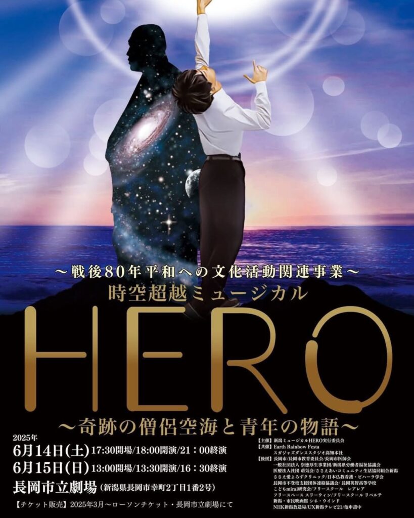 昨年、聖籠町にて講演されたミュージカル『HERO~奇跡の僧侶空海と青年の物語~』が、令和7年6月14日(土)・15日(日)と長岡市立劇場にて講演されます。