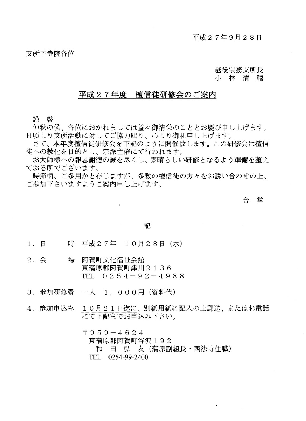 2015年9月28日 / 最終更新日時 : 2015年9月28日 echigo お知らせ行事 平成27年度 檀信徒研修会のご案内 FacebookXBlueskyHatenaCopy コメントを残す コメントをキャンセルメールアドレスが公開されることはありません。 ※ が付いている欄は必須項目ですコメント ※ 名前 ※ メール ※ サイト 次回のコメントで使用するためブラウザーに自分の名前、メールアドレス、サイトを保存する。 上に表示された文字を入力してください。 Δ